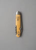 Lame en acier inox Sandvick, manche en buis pyrogravé, équipé d'un tire-bouchon, décapsuleur et ouvre-boîte.